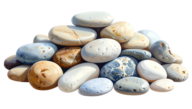 A pile of smooth, rounded stones of varying colors and sizes, stacked together