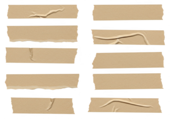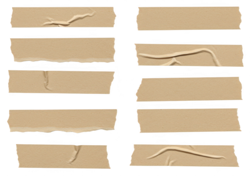 Collection of torn and wrinkled beige masking tape strips on a transparent background