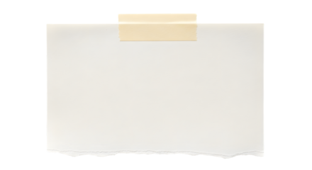 A blank piece of torn paper, taped to a transparent background with a single strip of beige masking tape at the top, isolated on transparent background