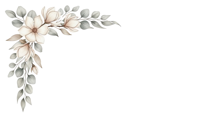 Soft watercolor floral corner design with magnolia blooms and eucalyptus in neutral beige tones isolated on white background