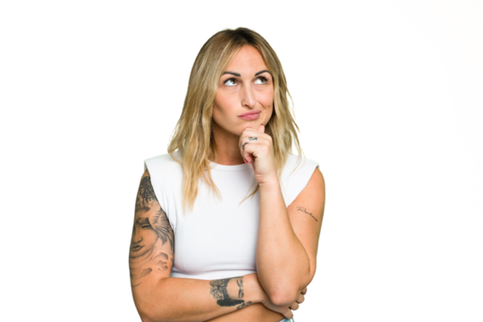 Young caucasian woman cutout isolated thinking and looking up, being reflective, contemplating, having a fantasy.