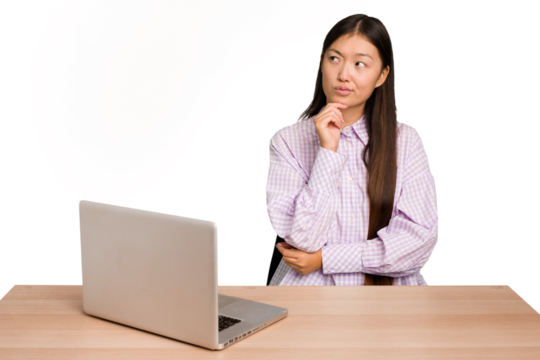 Young student asian woman in a workplace with a laptop isolated thinking and looking up, being reflective, contemplating, having a fantasy.