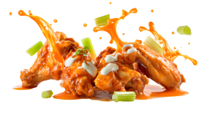 Buffalo chicken wings being tossed in spicy sauce with celery and blue cheese dressing on white background with food and meal and appetizer and snack