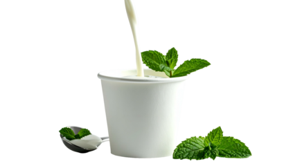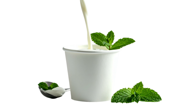 Stream of white liquid being poured into paper cup with mint sprigs, spoon present