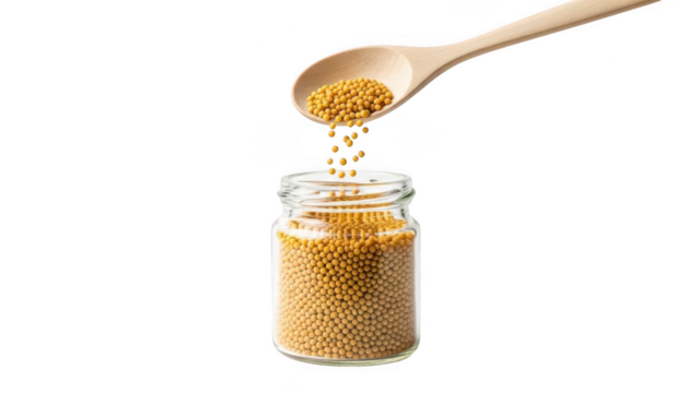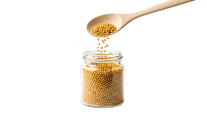 Mustard seeds being poured into a glass jar isolated on transparent background