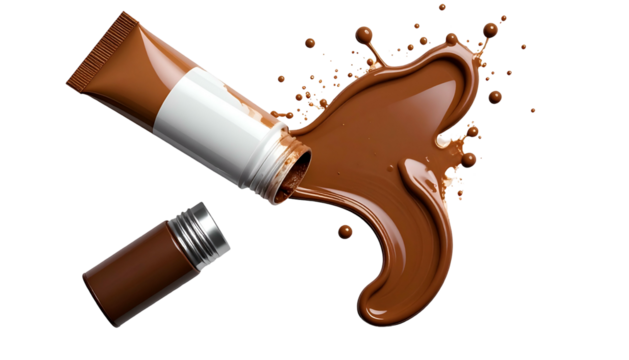 A creative illustration featuring a tube of brown liquid being squeezed onto a surface, creating a dynamic splash effect. A cap sits below