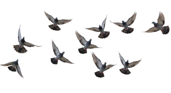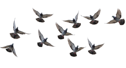 Multiple domestic pigeons, rock doves, in dynamic mid-flight, wings spread, varied positions, gray, white, brown plumage, on a transparent studio background with copy space. Concept of unleashed