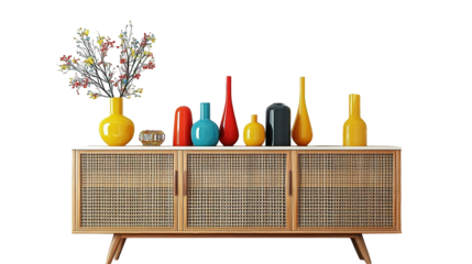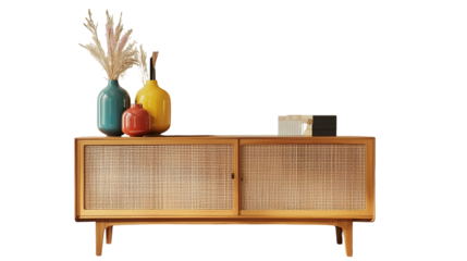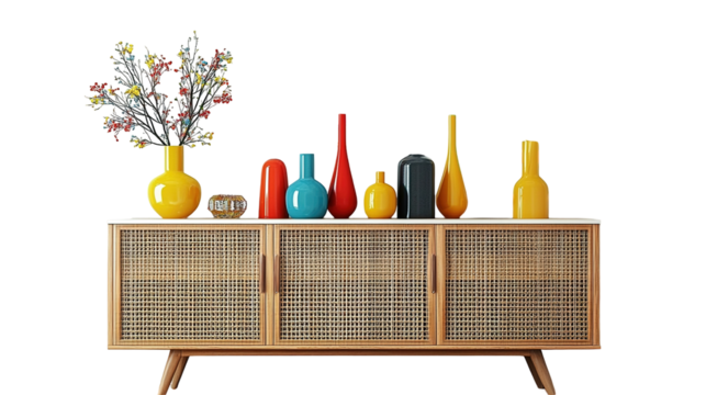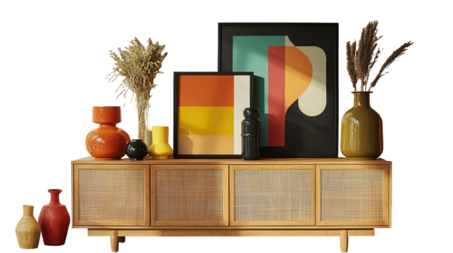 Vase with Anthurium flowers and ornaments on a wooden sideboard with blank artwork on the wall