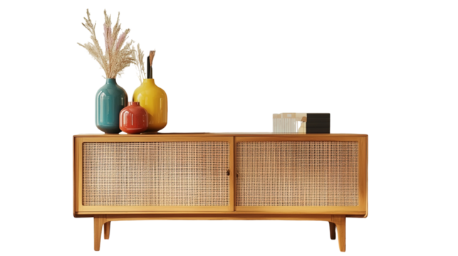 Stylish wooden chair next to a sideboard in a modern living room