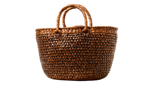 Woven straw market bag from Belize, half-filled, displayed with studio-quality lighting on white background