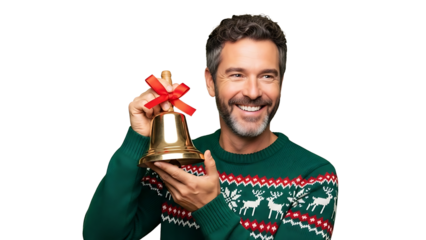 A man is joyfully holding a golden bell with a red ribbon. He is wearing a green sweater and smiling at the camera