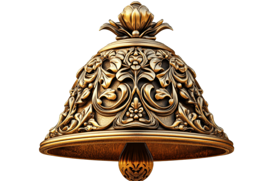 A shiny golden bell atop a black base, isolated against a transparent background