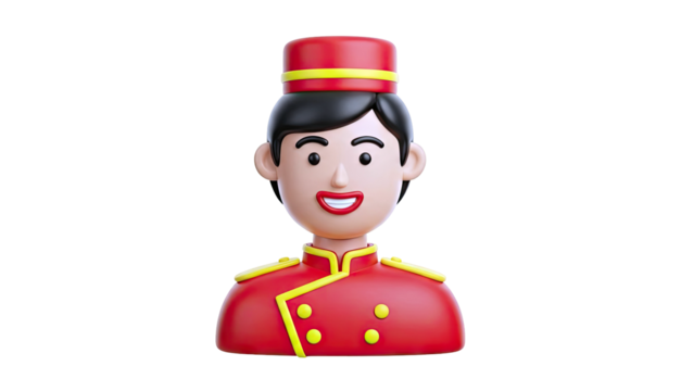 Wooden bellhop figurine isolated PNG, charming vintage toy with blue uniform and yellow hat for collectors and nostalgic decor