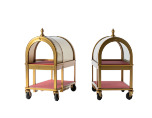 Two ornate luggage carts with gold frames, glass tops, red interiors, and black wheels