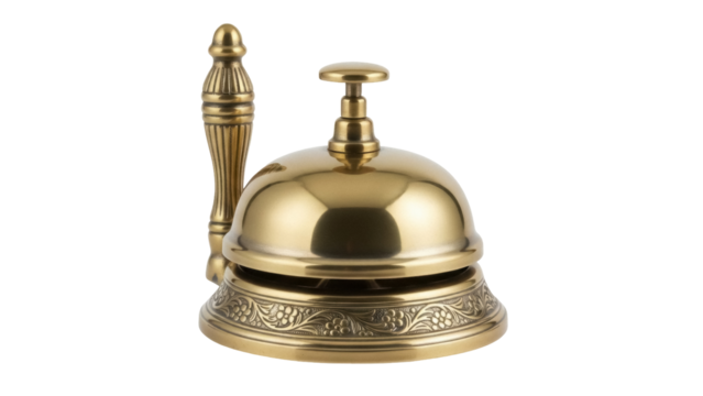 Isolated, vintage brass hotel reception desk call bell; concierge, bellhop service