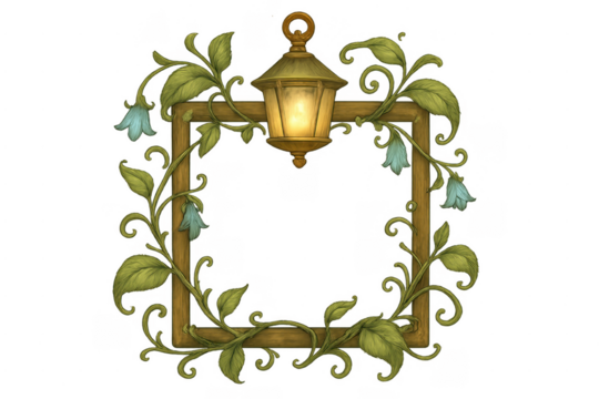 Wooden frame with glowing lantern and botanical bellflowers artwork