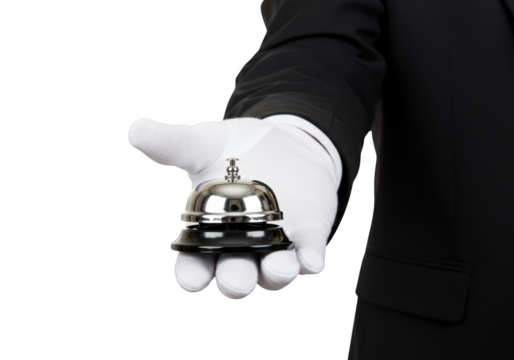 A gloved hand of a hotel bellhop holding a silver service bell for assistance isolated on transparent background