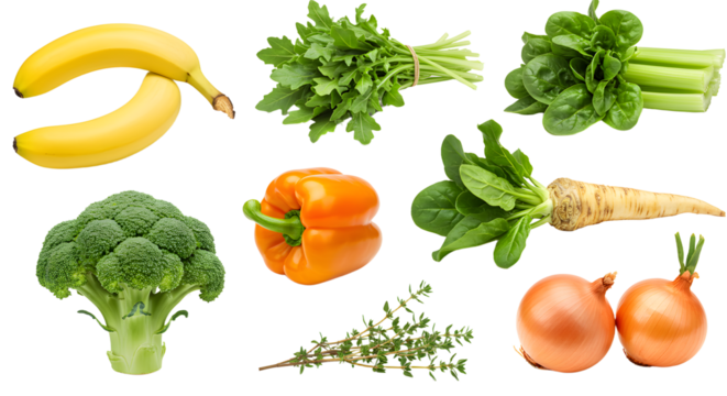 Fresh healthy vegetables and herbs including broccoli, orange bell pepper, onions, celery, parsnip, spinach, and bananas isolated on white background, perfect for cooking and nutrition