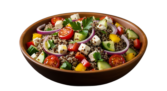 Fresh quinoa salad with vibrant vegetables in wooden bowl on transparent background