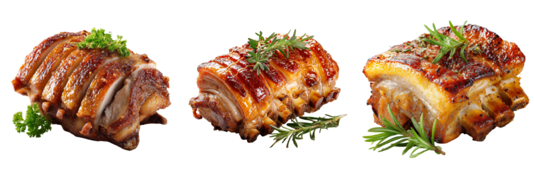 Set of Tender pork belly slices with aromatic herbs on transparent png background. Ai generated
