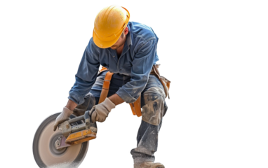 Construction worker using a belt sander on-site for surface smoothing and finishing Isolated on Transparent background PNG