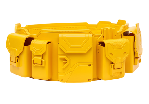 A vibrant yellow utility belt with numerous compartments and intricate detailing.