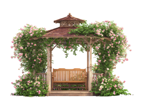 Romantic wooden garden gazebo with a bench overgrown with lush pink and white climbing roses.