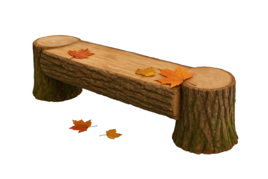 Rustic Log Bench Adorned with Autumn Maple Leaves, Showcasing Natural Wood Texture and Organic Design