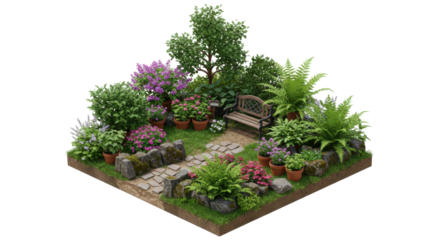 Lush garden scene featuring vibrant flowers greenery stone path and wooden bench isolated on white background