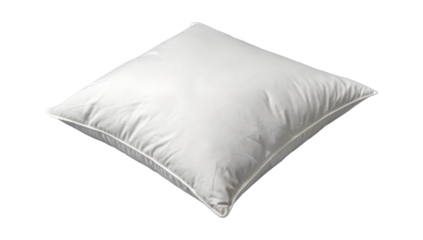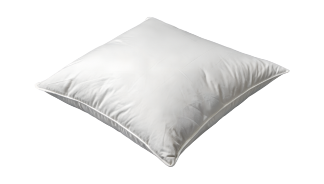 A fluffy white square cushion with soft folds shown from an angled perspective isolated on transparent background