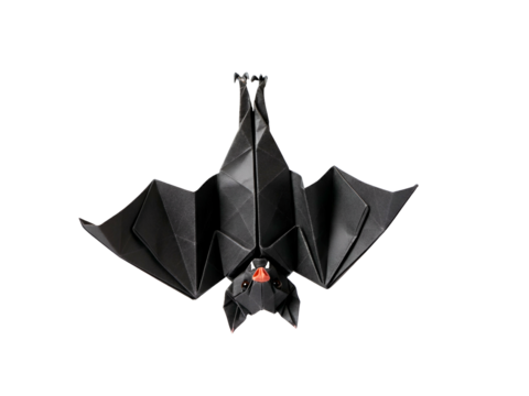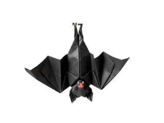 An origami bat made of black paper, hanging upside down with its wings spread wide, against a white background.