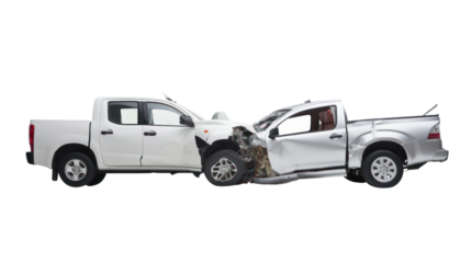 white pickup car get damaged by accident isolated on transparent and white background.PNG image