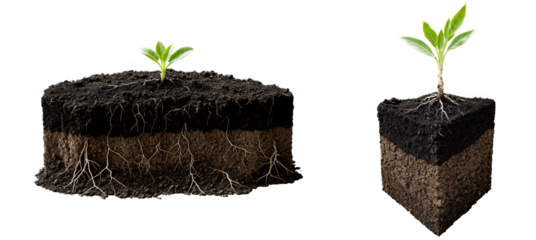 Cross-section of soil with plant toots showing, young green seedling growing in earth layers with a slightly cracked surface, isolated on a transparent background