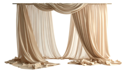 Elegant draped sheer curtains with a rod, creating an opening, on black background