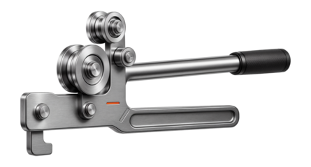 Manual tube bender with an adjustable roller system for bending stainless steel pipes in a marine environment.