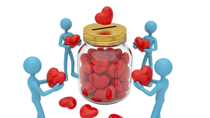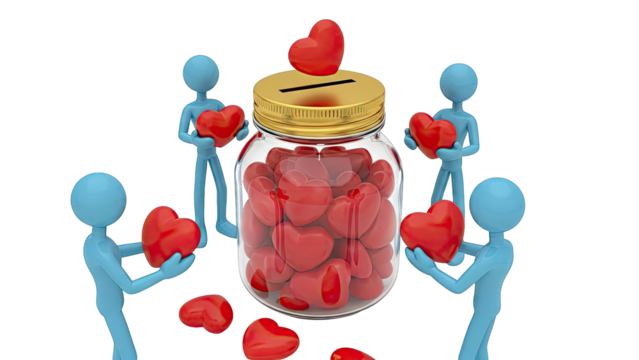 Blue figures donate hearts to a jar, symbolizing charity and love