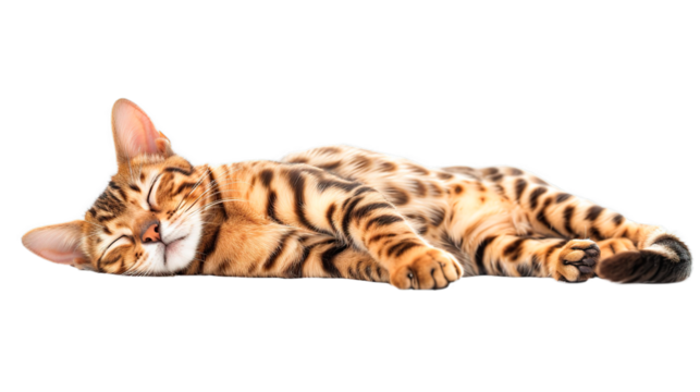 Healthy sleeping pet bengal kitten sleeps relaxed on a transparent background.