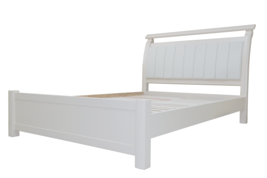 painted white double wooden bed with upholstered leather headboard, on isolated background