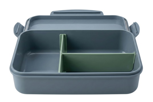 Two-tier bento lunch box with tight latch and flush divider, matte body and clean seams, isolated on transparent background.