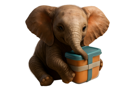 A charming baby elephant holds a colorful bento box, ready for a delightful meal isolated on transparent background