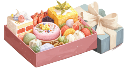 Fresh and delicious bento mini vanilla cupcakes with whipping cream pastel colors. on transparent background