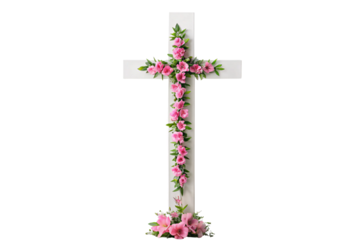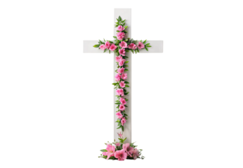 White cross decorated with pink flowers and greenery, isolated on a transparent background