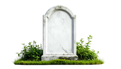 An isolated, marble tombstone sits on grass with shrubs, devoid of any text