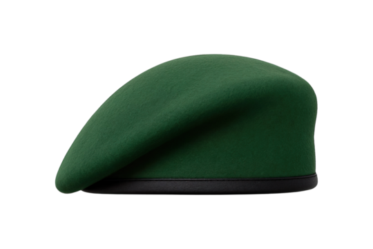 Side view of green military beret hat with leather trim, isolated on transparent background, generative ai