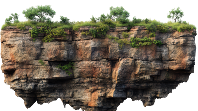 Floating island rocky formation with trees and greenery, isolated on transparent background