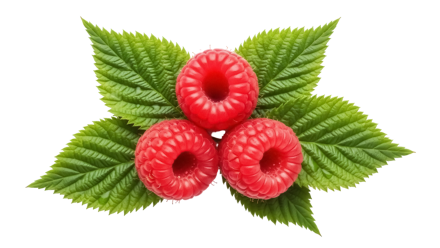 Three vibrant red raspberries with green leaves PNG isolated on transparent background, fresh summer fruit for healthy eating and design