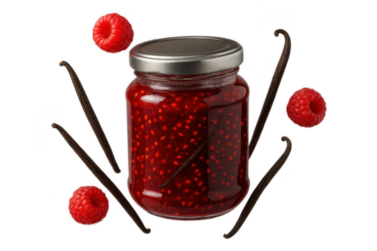 Raspberry jam jar with fresh berries and vanilla pods isolated on transparent background
