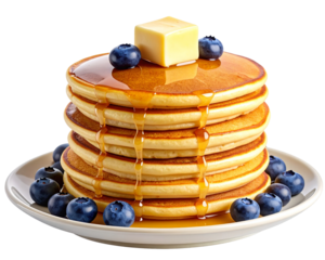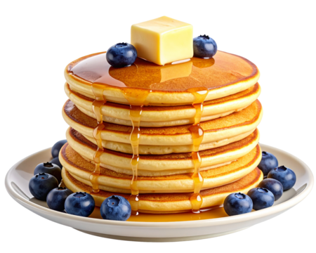 A tall stack of golden-brown pancakes topped with melting butter and fresh blueberrie