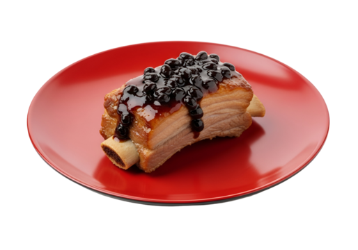 A delicious, roasted pork rib, glazed with a rich dark berry sauce, sits artfully on a vibrant red plate against a black background.