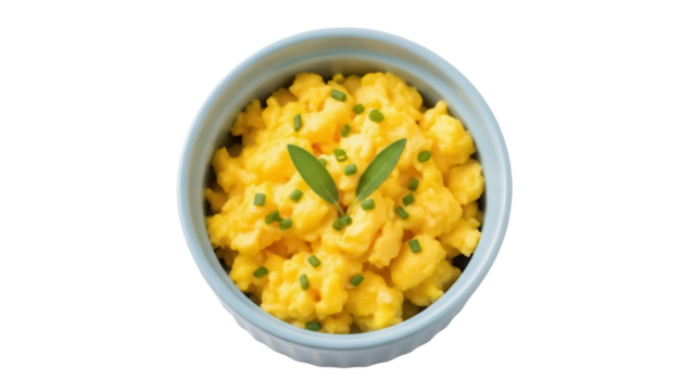 Isolated bowl of scrambled eggs topped with herbs, healthy breakfast ready to be served